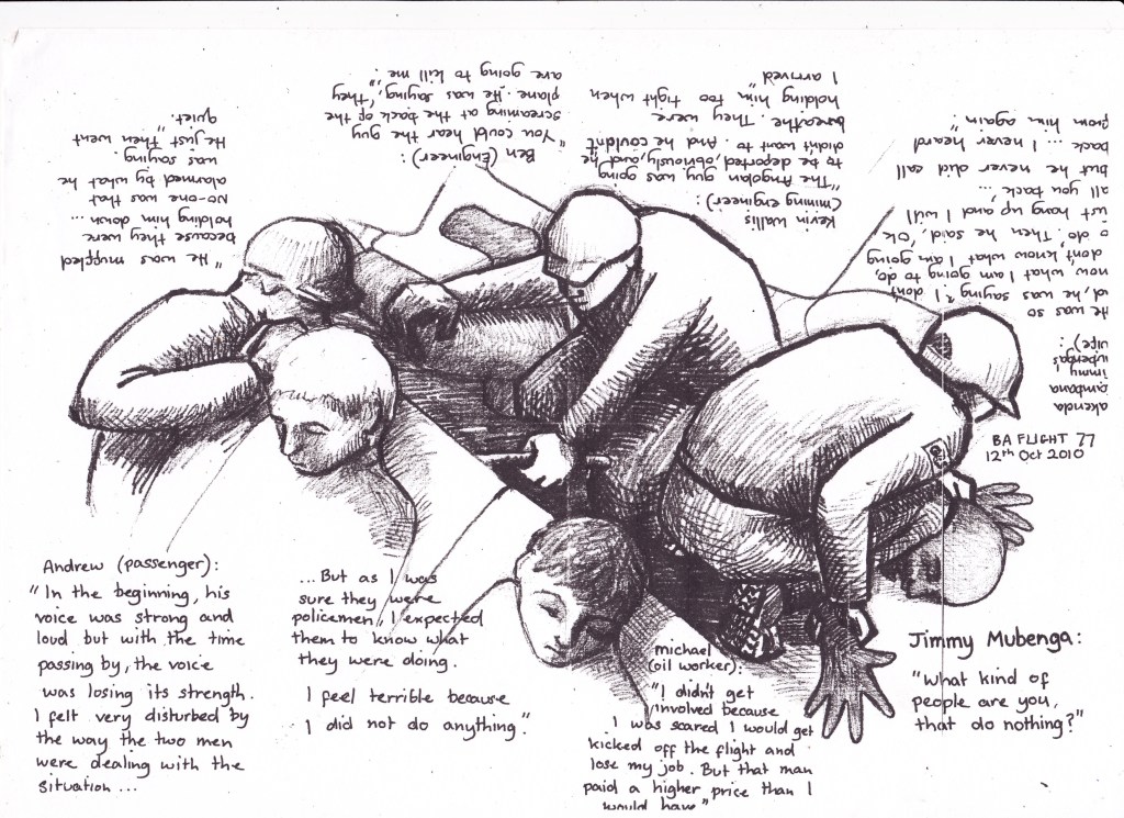 Jimmy Mubenga died on 12th October 2010 while being restrained by 3 G4S guards on a deportation flight to Angola. Those responsible for his death walked free from court. This mini-zine contains accounts from witnesses called at the investigation into Jimmy’s death.